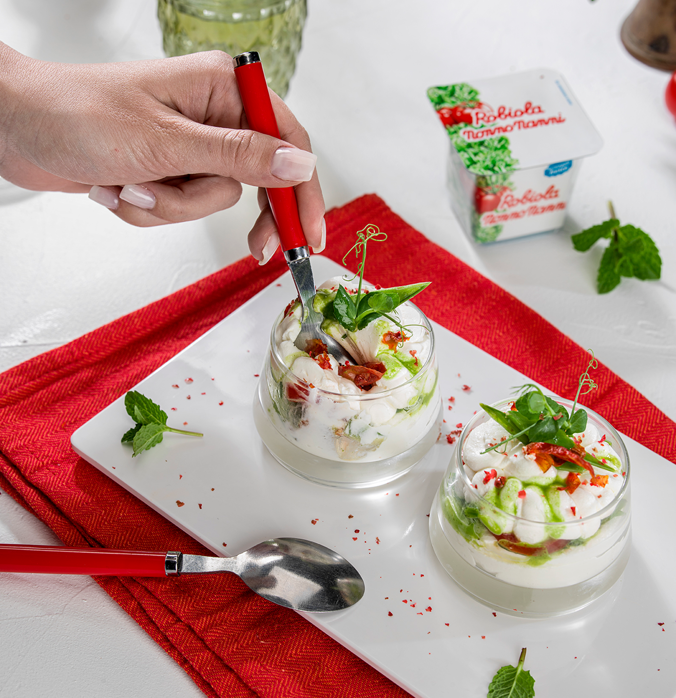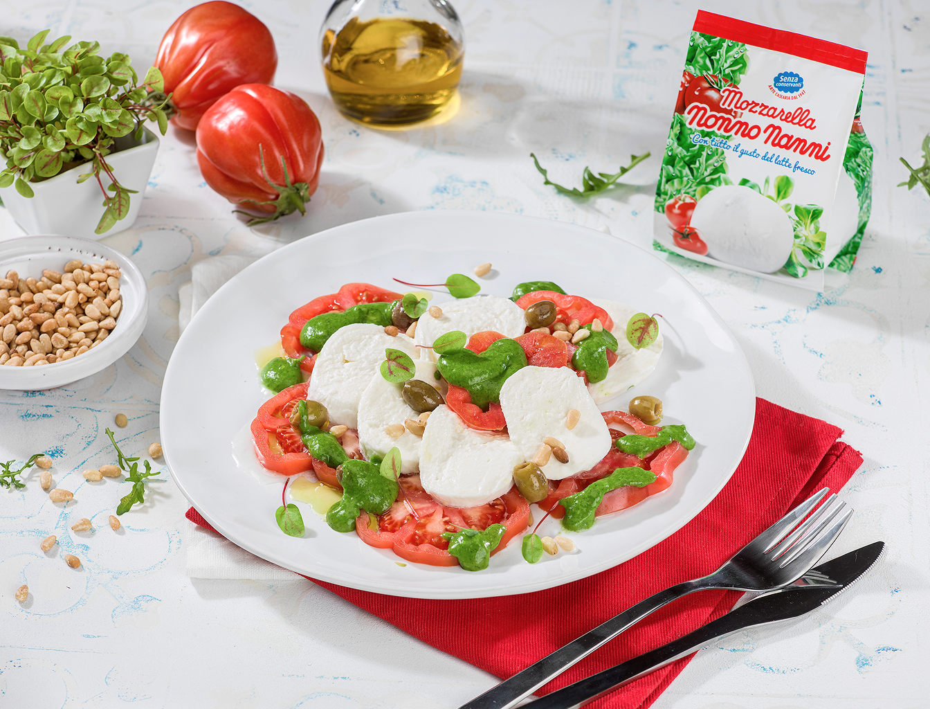 Pomodoro cuore di bue a fette, mozzarella, pesto di rucola e pinoli