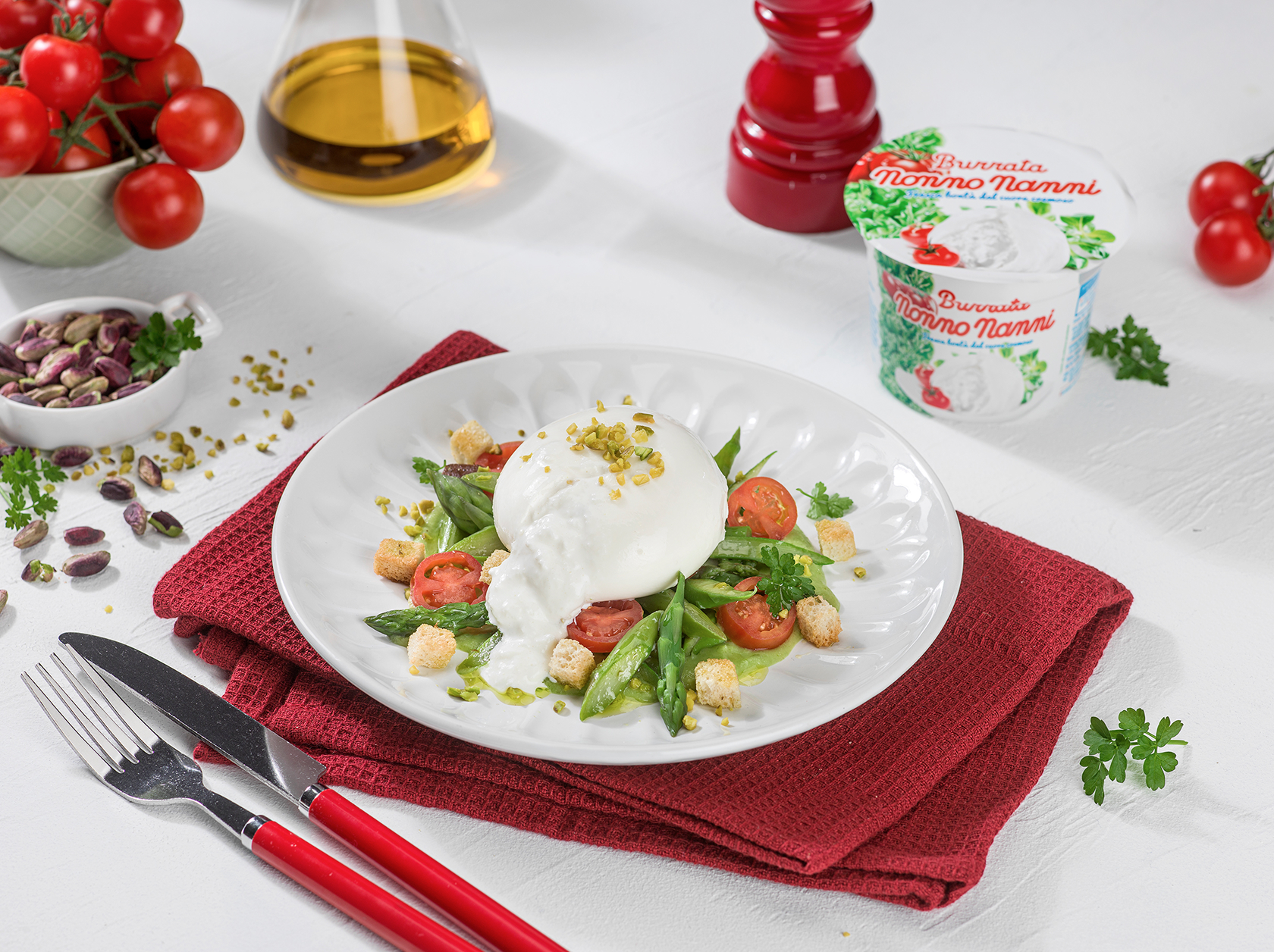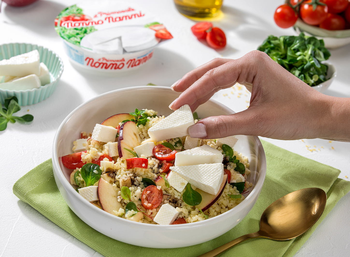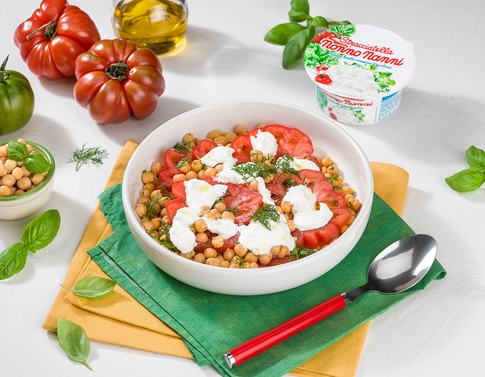 Bowl mediterranea con ceci, stracciatella, finocchietto e pomodoro costoluto